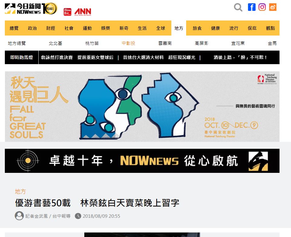 媒體報導感謝【今日新聞】報導天目城《林榮鉉書法個展》2018-08-12/通過: 天目小編 https://tian-mu.com.tw/wp-content/uploads/2018/08/金-1.jpg 787 963 天目小編 https://tian-mu.com.tw/wp-content/uploads/2025/12/logo-white-300x83.png 天目小編2018-08-12 13:09:552018-08-12 15:42:37感謝【今日新聞】報導天目城《林榮鉉書法個展》