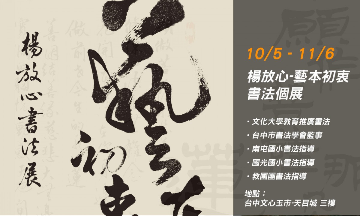 展覽新訊【展覽】楊放心藝本初衷書法個展2017年10月8日 【楊放心藝本初衷書法個展】 百大書法家之一,將生活中的體悟行雲流水地揮灑於筆墨間,將藝術回歸初衷,讓 人忍不住駐足欣賞。 2017-10-08/通過: phoebe https://tian-mu.com.tw/wp-content/uploads/2017/10/楊放心書法.jpg 720 1200 phoebe https://tian-mu.com.tw/wp-content/uploads/2025/12/logo-white-300x83.png phoebe2017-10-08 10:38:302019-04-07 12:30:53【展覽】楊放心藝本初衷書法個展