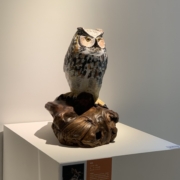 藝術家以細密入微的刀法刻出羽翼的層次,再以彩繪強化光澤與色階,使貓頭鷹的羽色呈現出近乎呼吸般的律動。