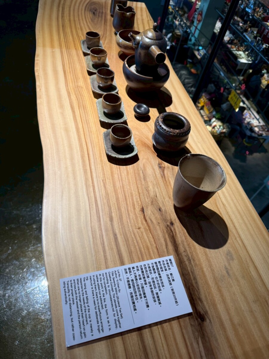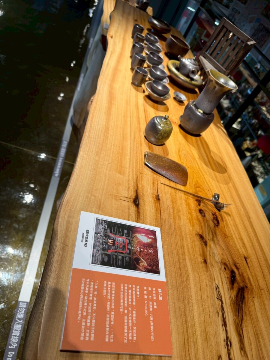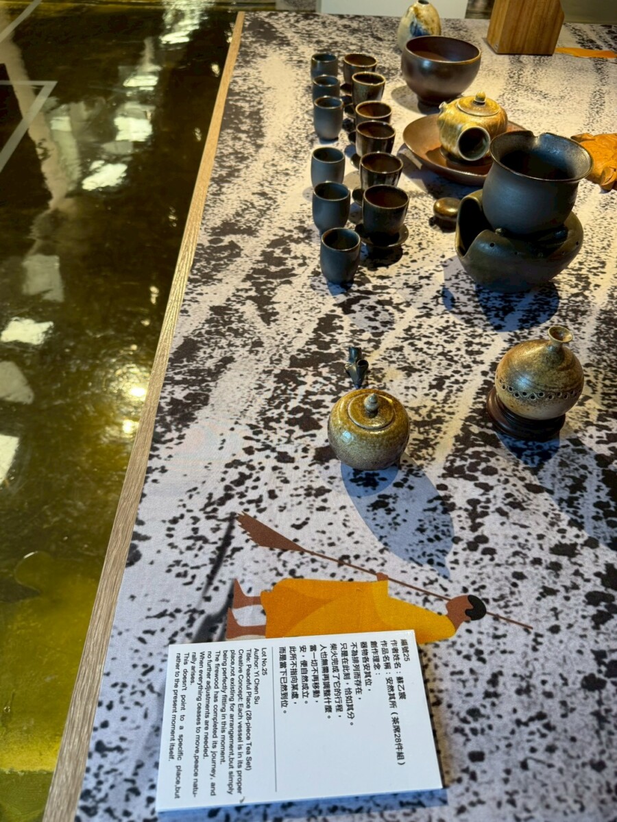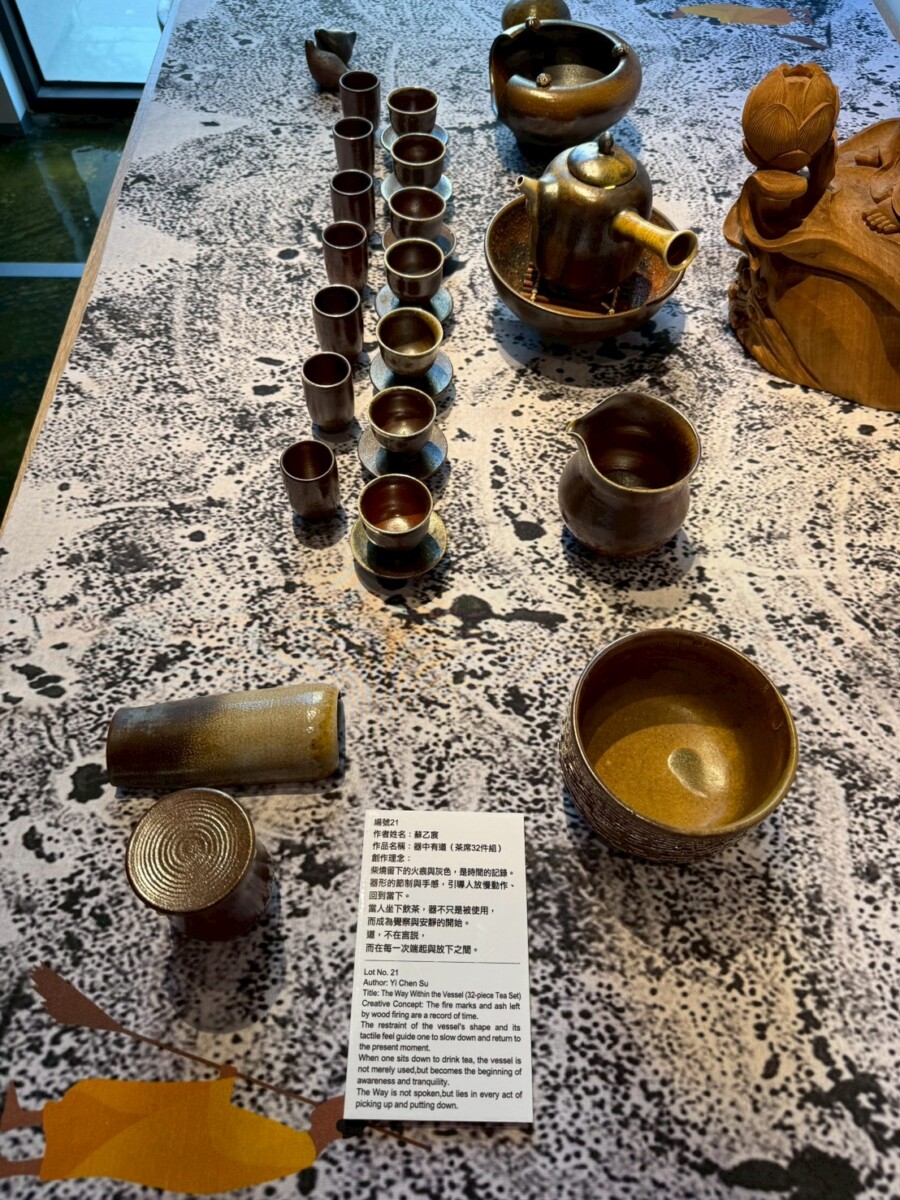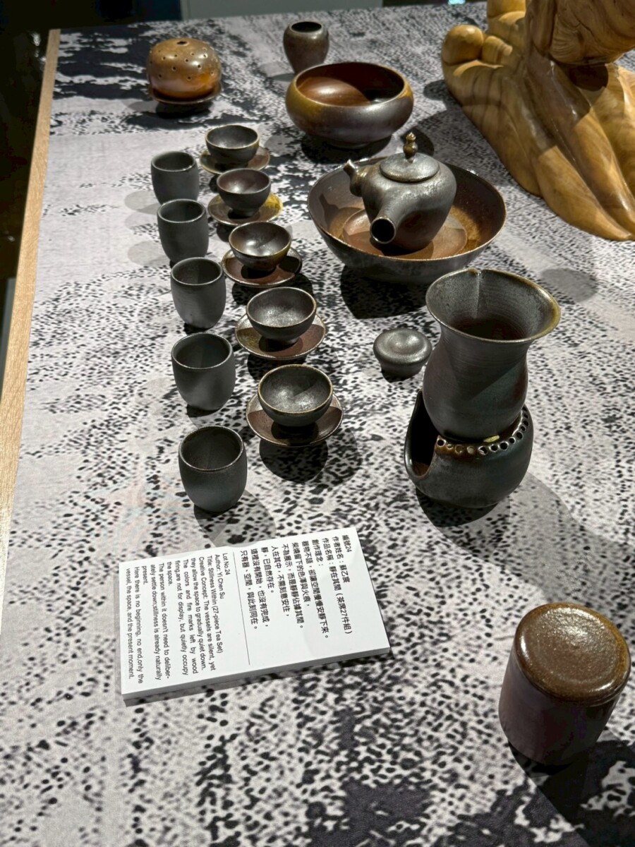 在《一盞一相》的創作對話裡,蘇乙宸的柴燒茶器與佛像木雕形成了靜與動、內觀與外觀的交織。佛像引導觀者停下腳步凝視內心,而茶器則透過鋪陳生活的節奏邀請觀者參與。在這一看一喝之間,觀者得以在茶香與木香中重返與自身的對話,感受時間、火候與願力如何在無聲中流動,進而找回在現代快節奏生活中迷失的自我。