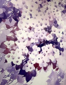 背景中紫色的暈染讓前景的花朵彷彿被光影輕輕托起,散發出令人屏息的浪漫氣息。筆觸之間,九重葛的輕盈、繁複與生命力躍然紙上。清晰的線條與水彩特有的水漬渲染,呈現出花朵在風中微微搖曳的姿態,為畫面增添了生動與靈動。