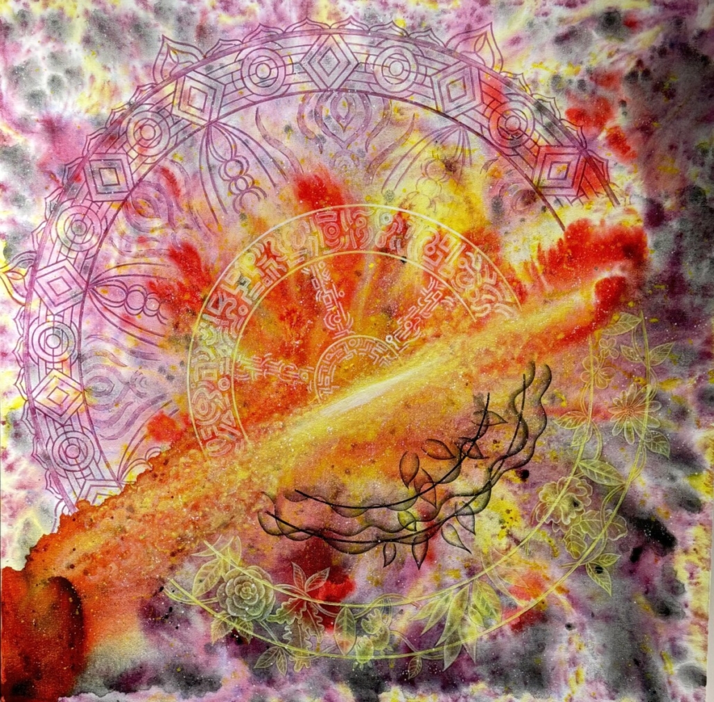 《曼陀羅之日》以強烈的爆破感引領視線。畫面中央的環狀曼陀羅紋樣層層疊疊,由外而內交織出象徵太陽能量的符號結構。細緻的幾何圖紋與類似古代符印的線性元素,隱隱透出宇宙法則的秩序。藝術家以亮橙、烈黃、火紅等暖色向外迸散,宛如一股無差別的生命之火,向四方擴張。色彩噴灑的紋理呈現出「燃燒的霧態」,其後方靈動的紫紅與黑色雲氣,則讓畫面在爆烈之間保有神祕深度,象徵生命誕生時的混沌能量。枝狀的黑色紋理穿越光束,彷彿植物的脈絡與生長勢能,也象徵生命從日光中獲得躍動。