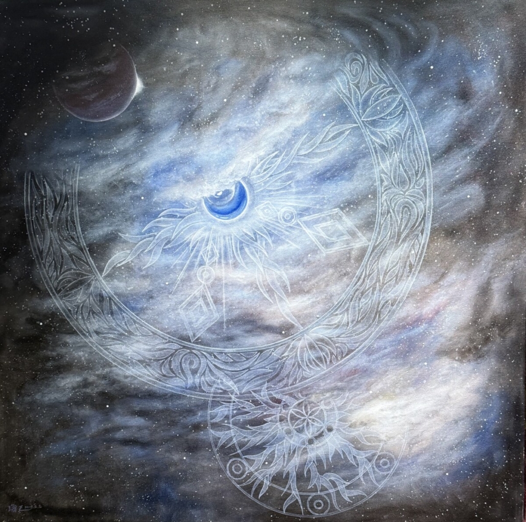 《曼陀羅之月》則以截然相反的語氣輕輕呼吸。冷藍、霧白與深墨色構築出一個緩慢旋動的宇宙。中央的月眼般光點以柔和藍色微微脈動,帶出寧靜卻不可忽視的能量。藝術家以極細緻的白色線條描繪半弧形曼陀羅結構,紋樣彷彿在雲層中隱現,是夜空最深層的律動。符印般的圖紋,如潮汐般收放,帶有靜謐的秩序感,與周圍霧狀筆觸形成溫柔的視覺震盪。作品右上角的彎月與遠星巧妙點出時間感,使整幅畫猶如凝結於宇宙邊緣的一瞬。