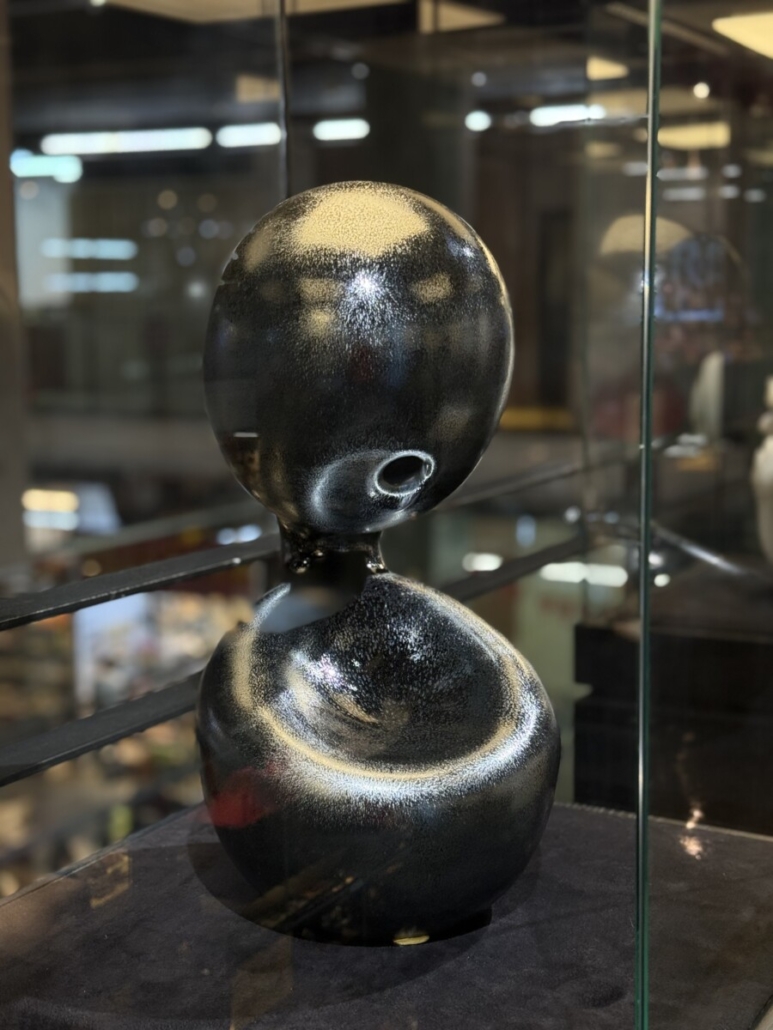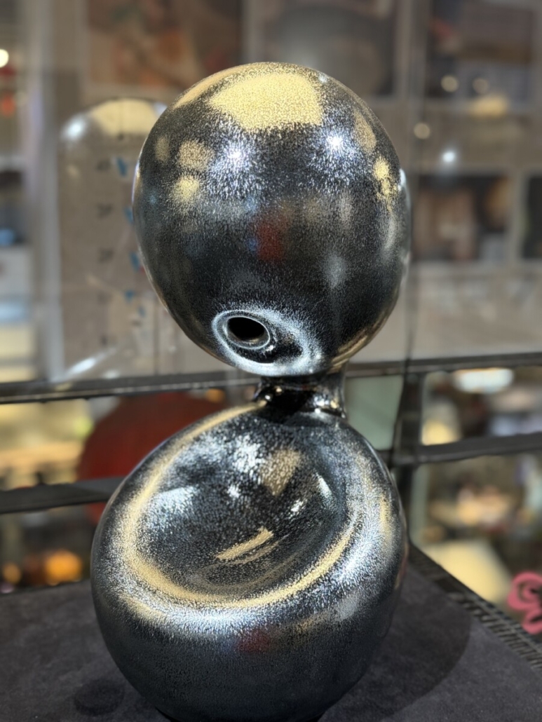 羅紹綺老師以其精湛的天目釉燒成技術,將傳統的陶瓷藝術推向一個充滿哲思與視覺震撼的新維度。這件作品的形態簡約、優雅而流暢,如一個沉靜而充滿力量的生命體,其表面肌理則完全是另一片宇宙。