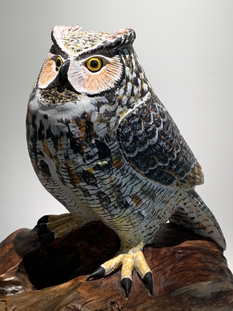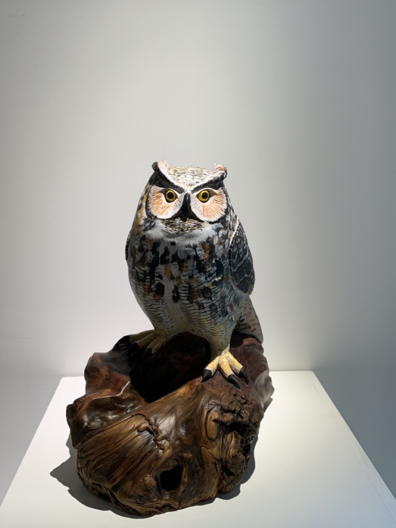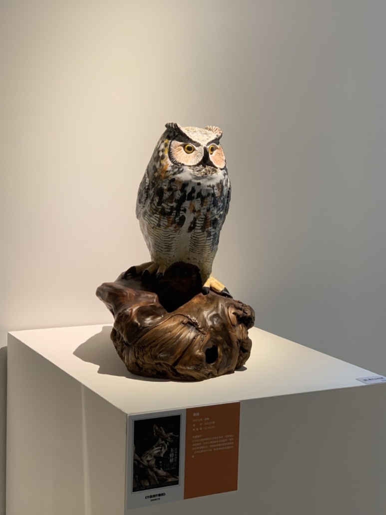 藝術家以細密入微的刀法刻出羽翼的層次,再以彩繪強化光澤與色階,使貓頭鷹的羽色呈現出近乎呼吸般的律動。