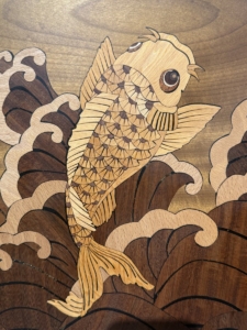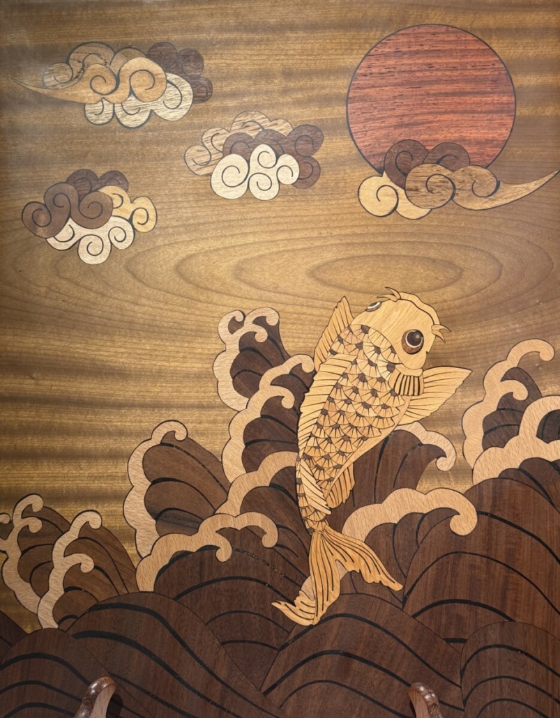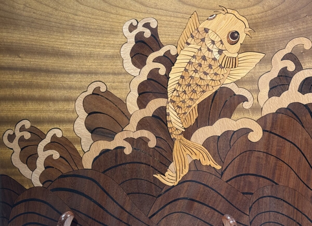 作品巧妙地捕捉了鯉魚望月的經典瞬間,鯉魚全身的鱗片和魚鰭都經過極為細緻的切割和鑲嵌,呈現出強烈的動態感,象徵著奮發向上、追求卓越的精神。