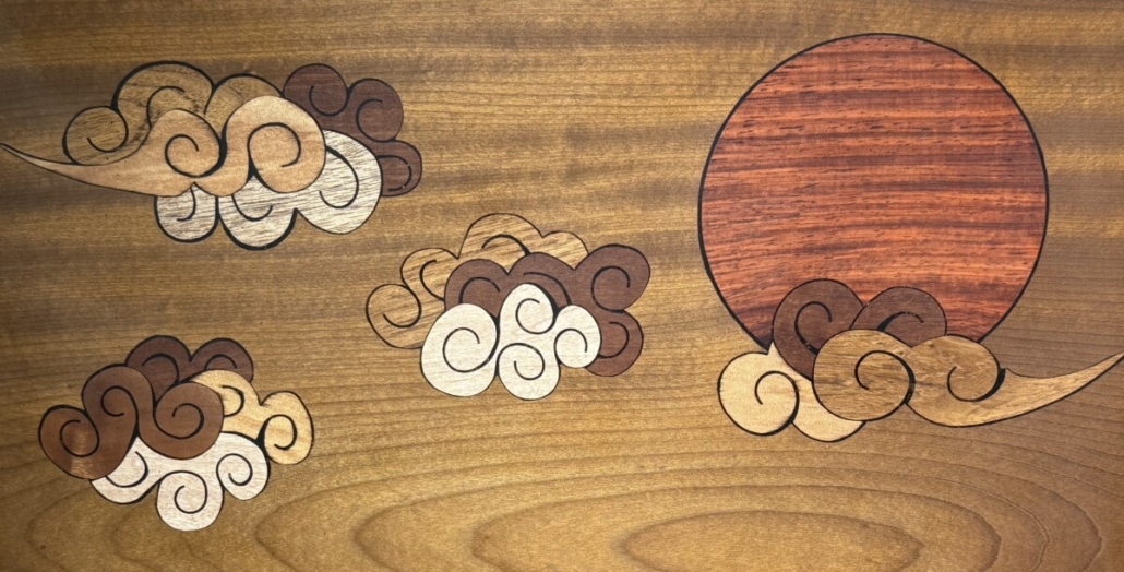 詹威明老師所使用的鑲嵌技法(手動切割、等比例鑲嵌)展現了功法的細緻多變。他利用不同木材的天然色澤進行層次的堆疊,創造出豐富的明暗對比和視覺深度。最難能可貴的是,從作品的側面觀察,圖案的每一層切割和鑲嵌都做到了前後一致的圖貌,體現了藝術家對工藝的極致追求。