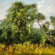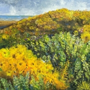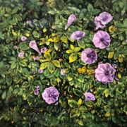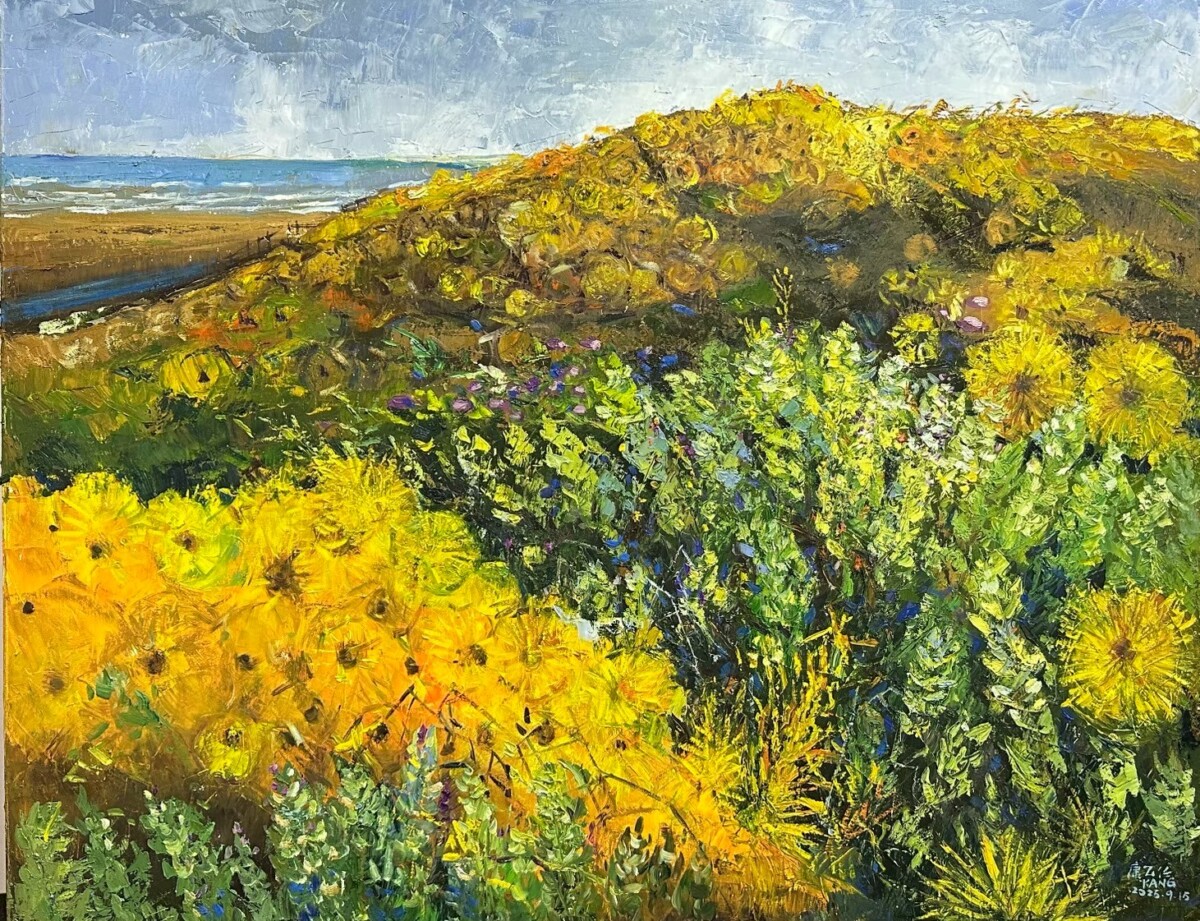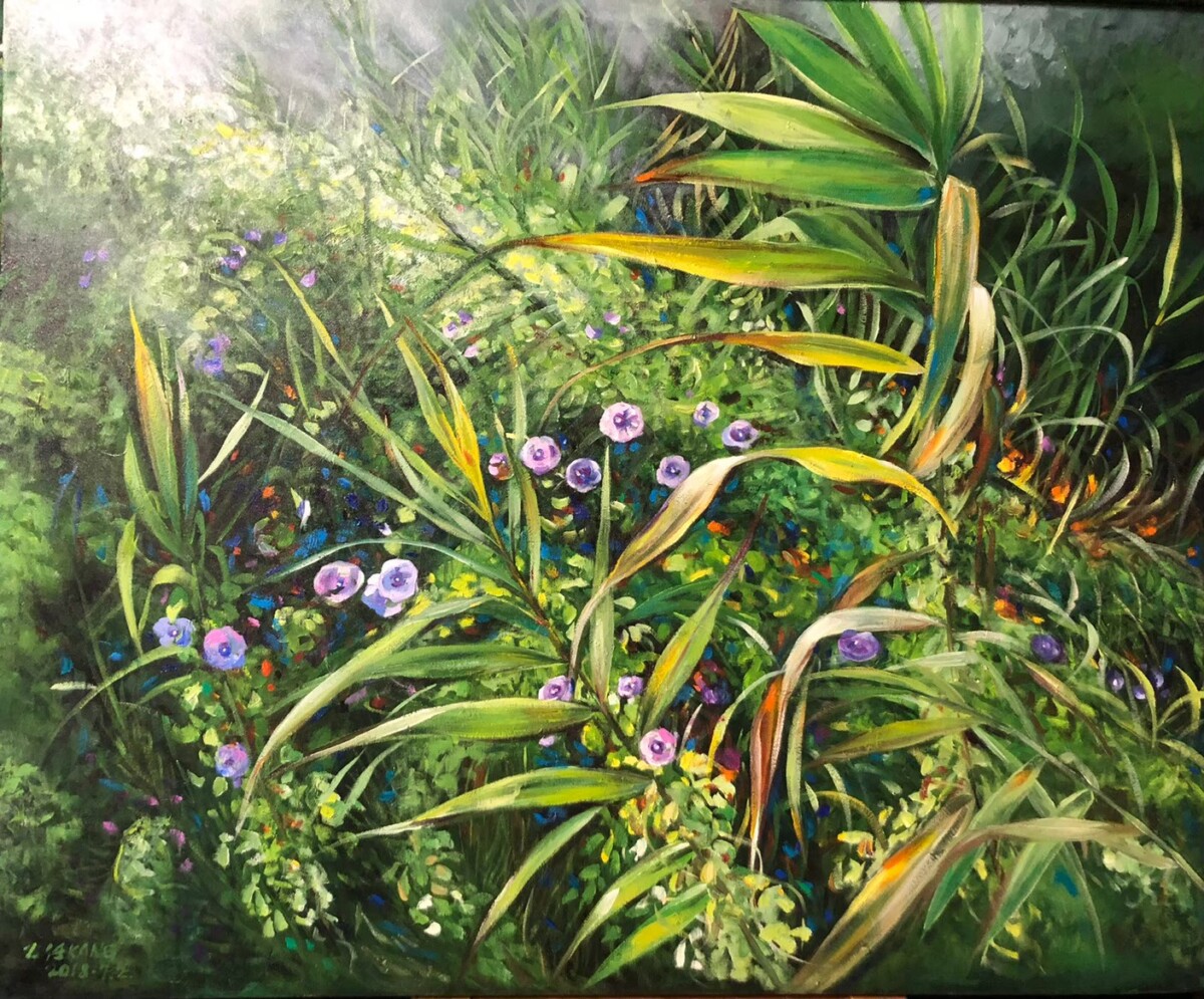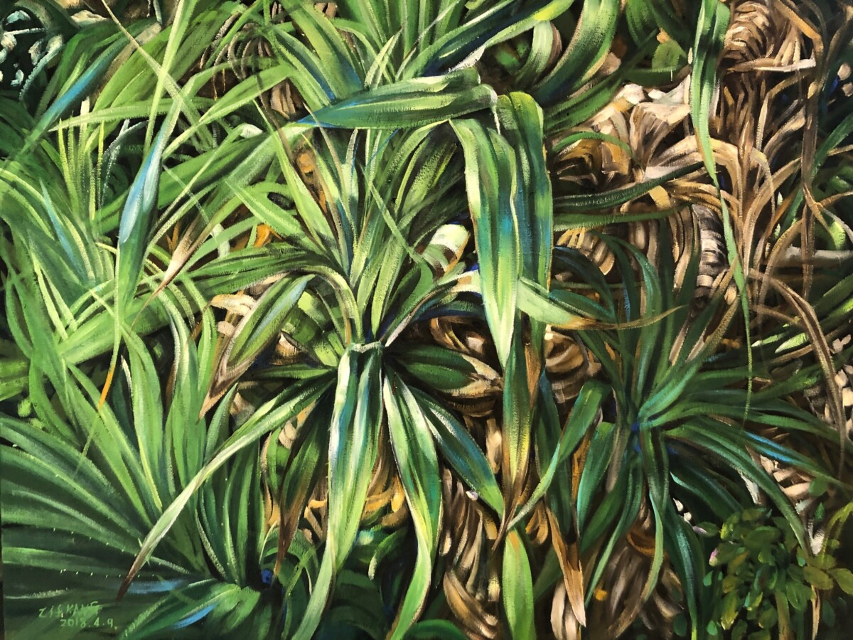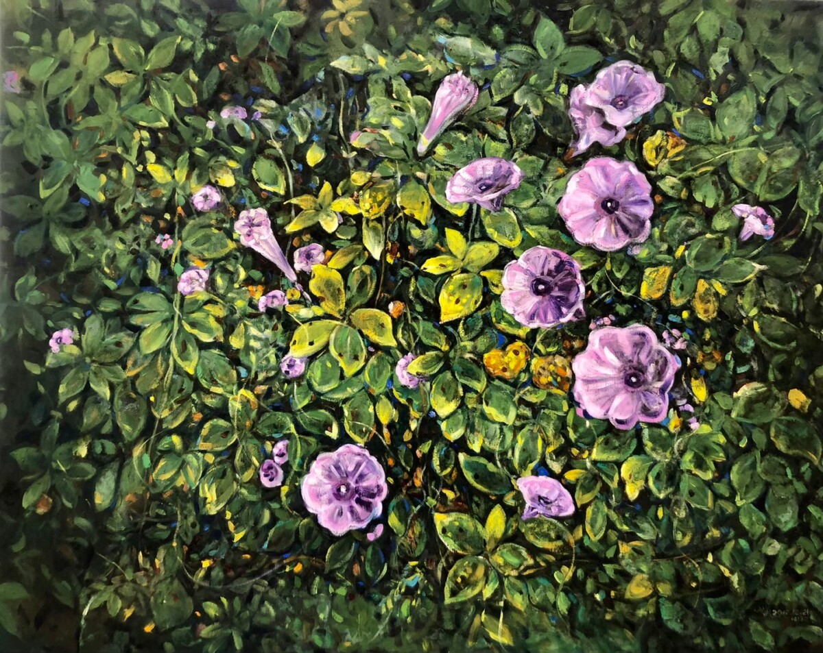 本次展覽精選十九年間的重要階段性作品,從早期水彩、粉蠟筆、素描到成熟油畫語彙的建立,完整呈現其技法轉型與精神深化的軌跡。畫面中的濱海草叢、藤蔓交織、田野花草與旅途窗景,看似日常平凡,實則隱含對時間流動、生命韌性與存在重量的長期思辨。