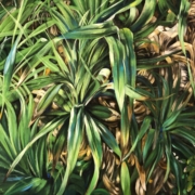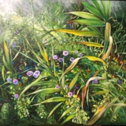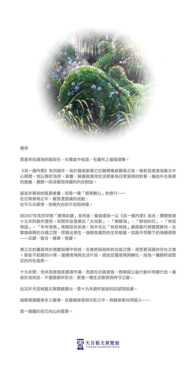2007年,康乙任在人生關鍵轉折之際離開職場,長期駐留濱海藝文中心,於海岸草叢、藤蔓與濱海生活景象中沉潛觀察。從外在風景入手,逐步轉向對內在情感與存在狀態的深層凝視,並將此系列統一命名為《另一層內景》——那是一種從可見風景通往不可見心境的通道。